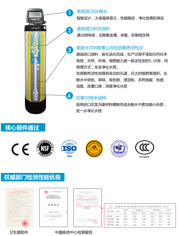 恬凈中央凈水機有效去除水中的異色、異味;進一步濾除水中微小雜質(zhì)、膠狀體;去除水中的漂白粉余氯、農(nóng)藥、重金屬;保留對人體有益的礦物質(zhì)。使水變得碧清、碧藍,去除對人體有害的物質(zhì)。