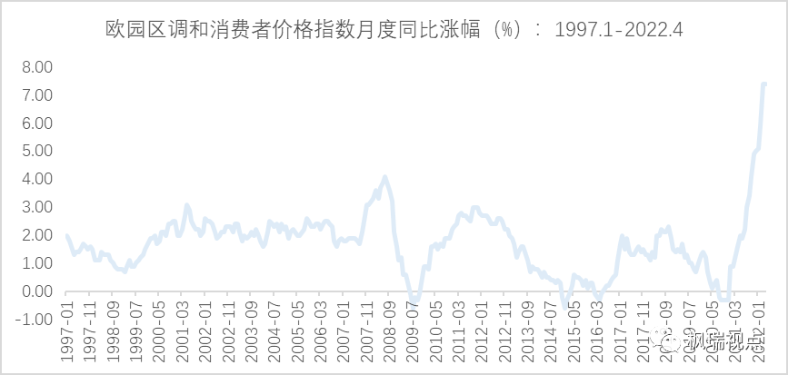 這將是歐央行自2011年以來的首次加息。2022年4月,歐元區(qū)物價調和指數(shù)同比上漲7.4%,與3月的漲幅持平,二者均為1997年1月以來的最高月度漲幅(圖一)。這大大超過歐央行設定的2%的平均通脹的政策目標。因此,歐央行加息是通脹壓力下的不得已而為之。